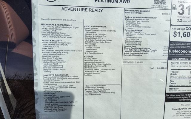 - Radio: AM/FM NissanConnect w/Navigation -inc: SiriusXM 360L, hybrid radio, enhanced voice recognition (one shot VDE, natural language understanding), Active Noise Cancellation, wireless Apple CarPlay, wireless Android Auto, 12.3" color HD display, Bluetooth®, 2 front USB type-C, Wi-Fi hotspot, Alexa Built-In, Google built-in: Google Assistant, Play Store, maps, data, NissanConnect Services powered by SiriusXM, SiriusXM Traffic and SiriusXM Travel Link